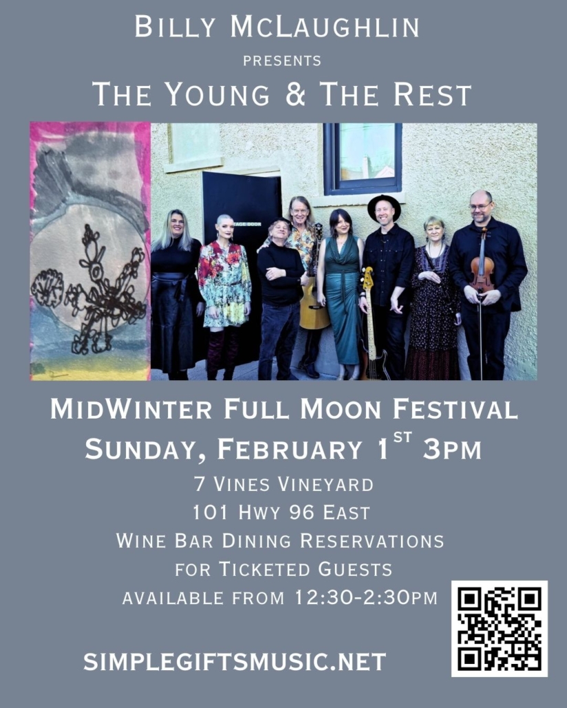 Come for lunch in the wine bar starting at 12:30pm (separate reservation required) and as the full February Snow Moon rises at 3pm so does the music of the Young and the Rest! Doors to the seating area open at 2pm and wine service continues in the concert hall throughout the show.